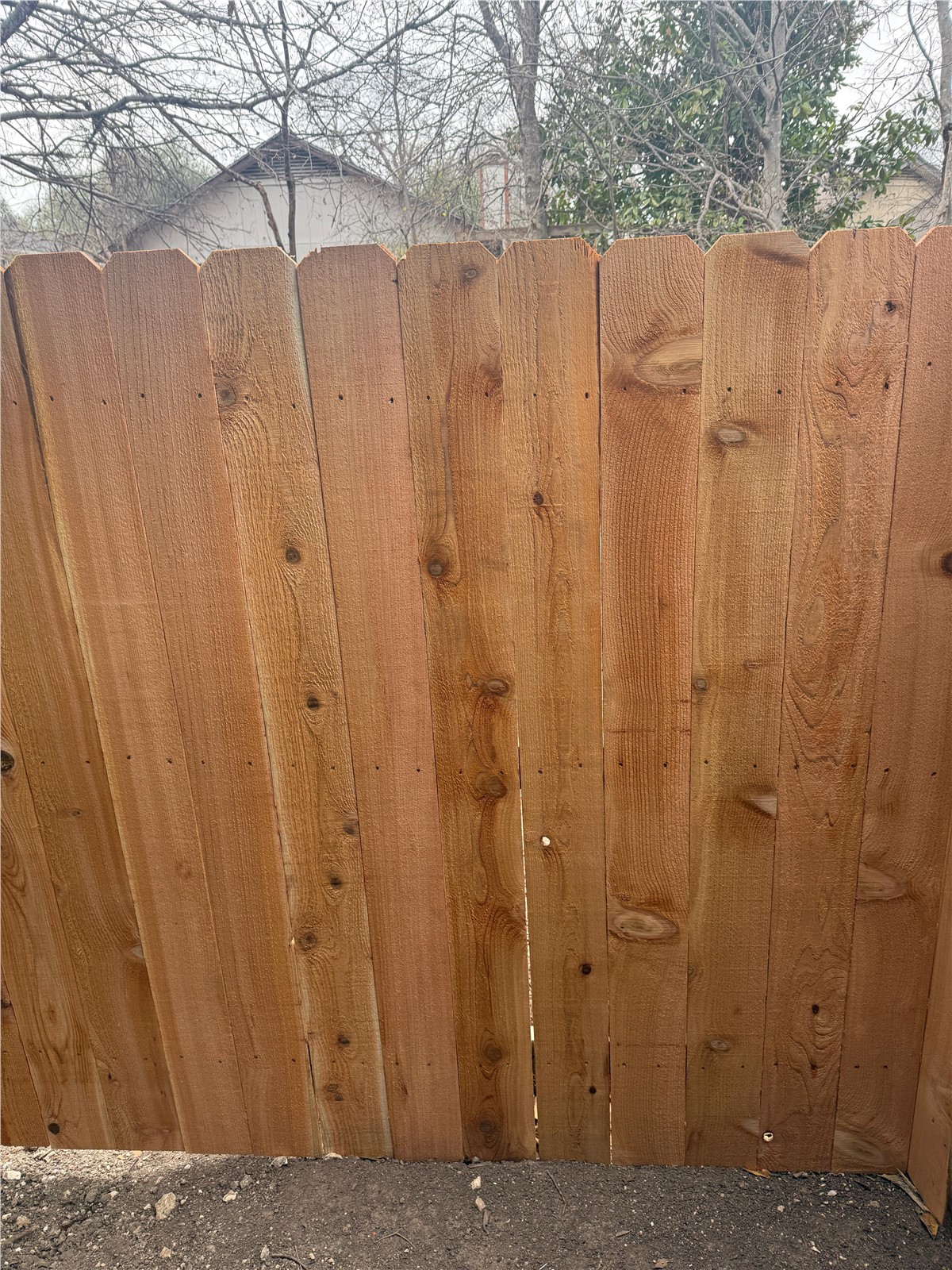 - 6' tall standard vertical cedar picket fence with 3 rails and aluminum round posts