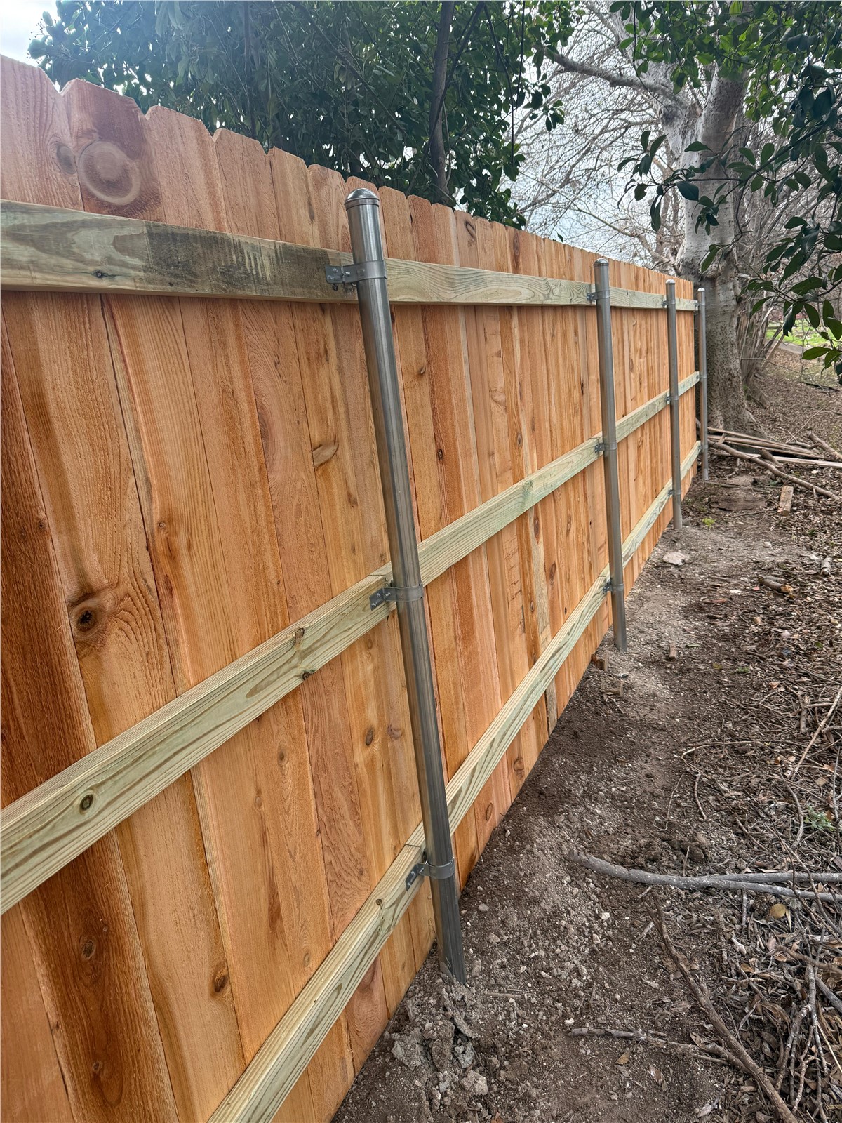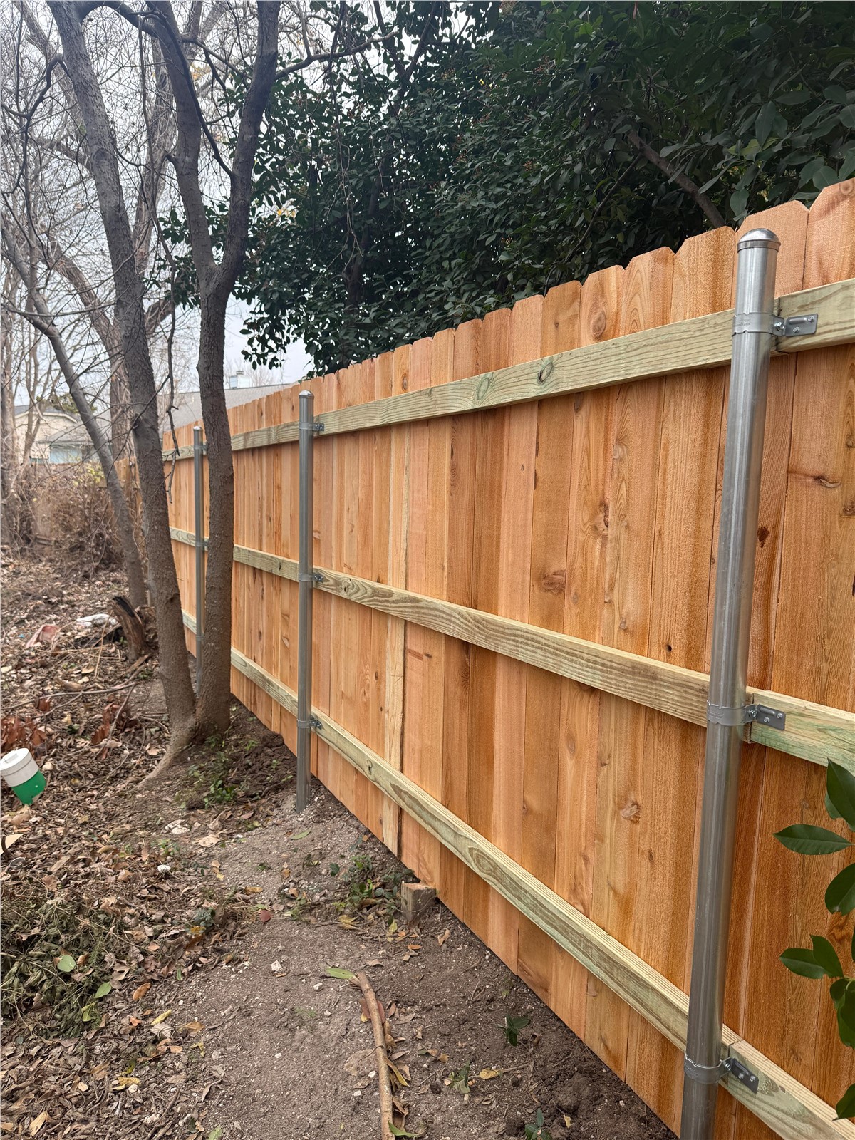 - 6' tall horizontal cedar picket fence with 3 rails and aluminum round posts